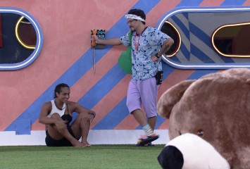 Na área externa, Linn da Quebrada e Eliezer disputam o Big Fone de um lado, Gustavo deita próximo...